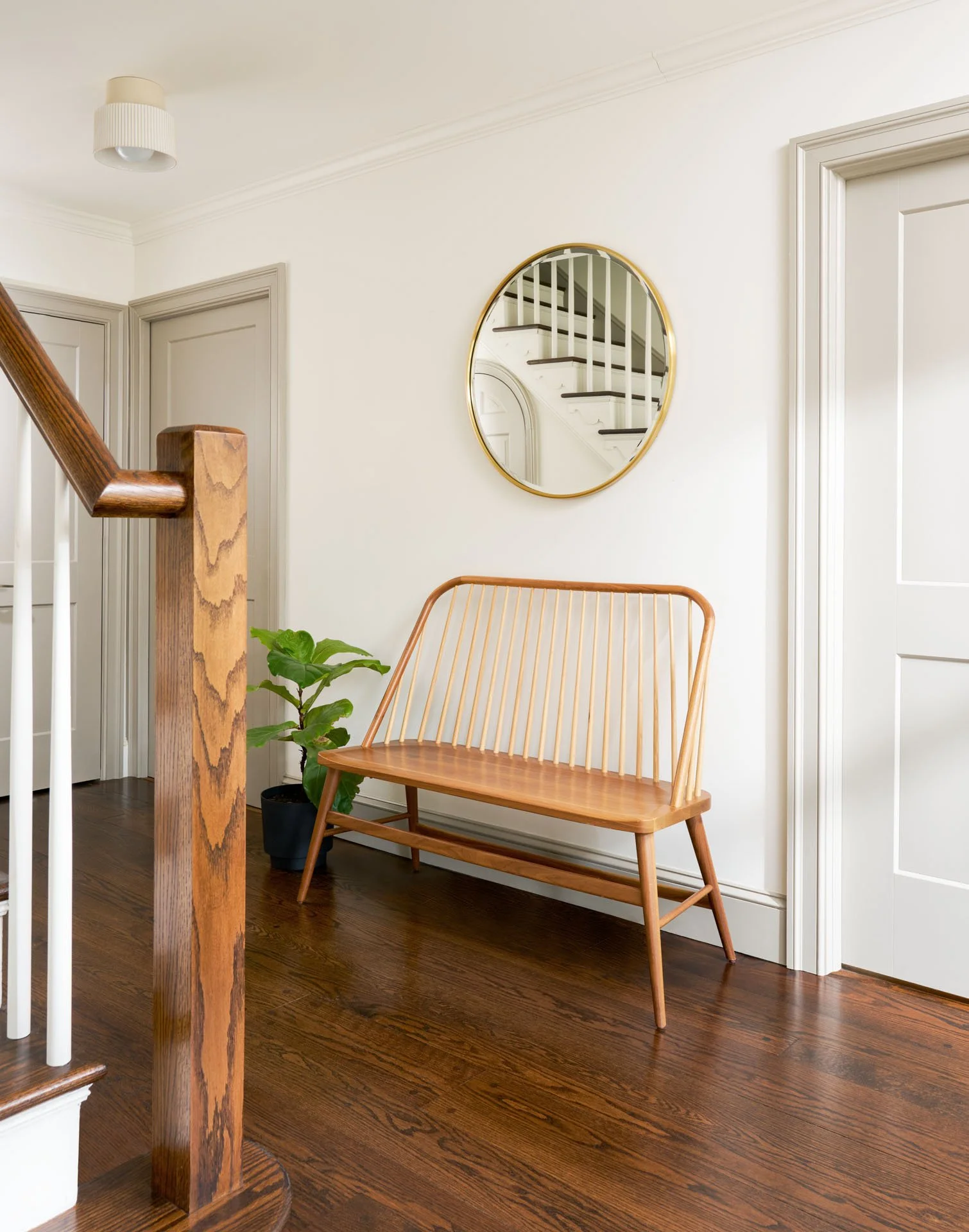 In the Living Room, casings around the window were removed and a flush window jamb-to-wall detail was designed to allow for the addition of 14" of width in the Foyer to the left and hidden cabinets to the right. A walnut bench/radiator cabinet and soffit complete the detail while adding additional lighting and storage.